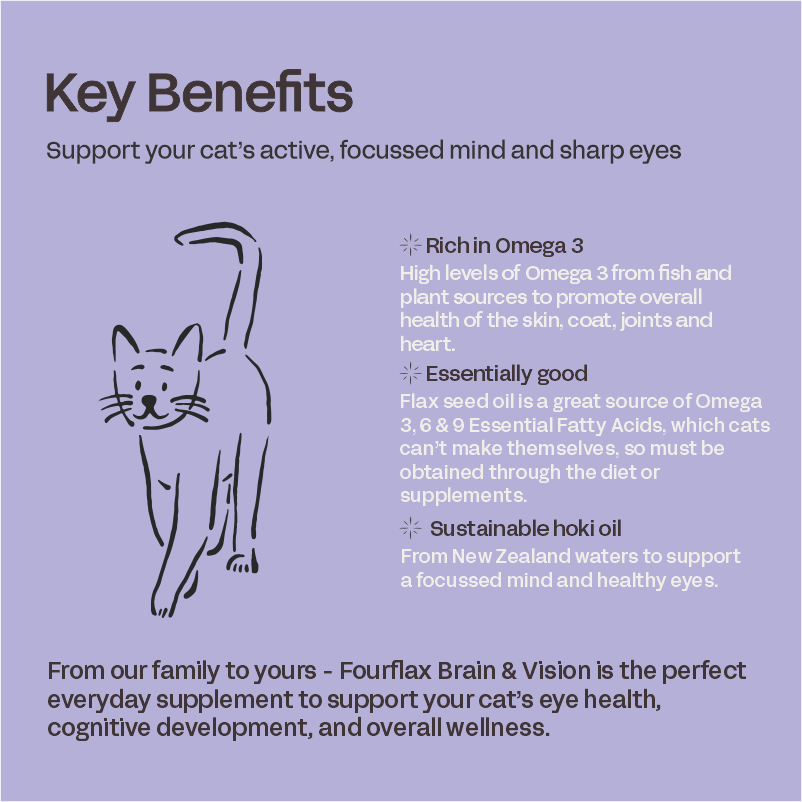 From our family to yours – Fourflax Brain and Vision is the perfect everyday supplement to support your cat’s cognitive development, healthy eyes and overall wellness.