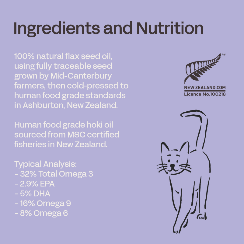 100% natural cold-pressed flax seed oil and New Zealand hoki oil from sustainable fisheries.