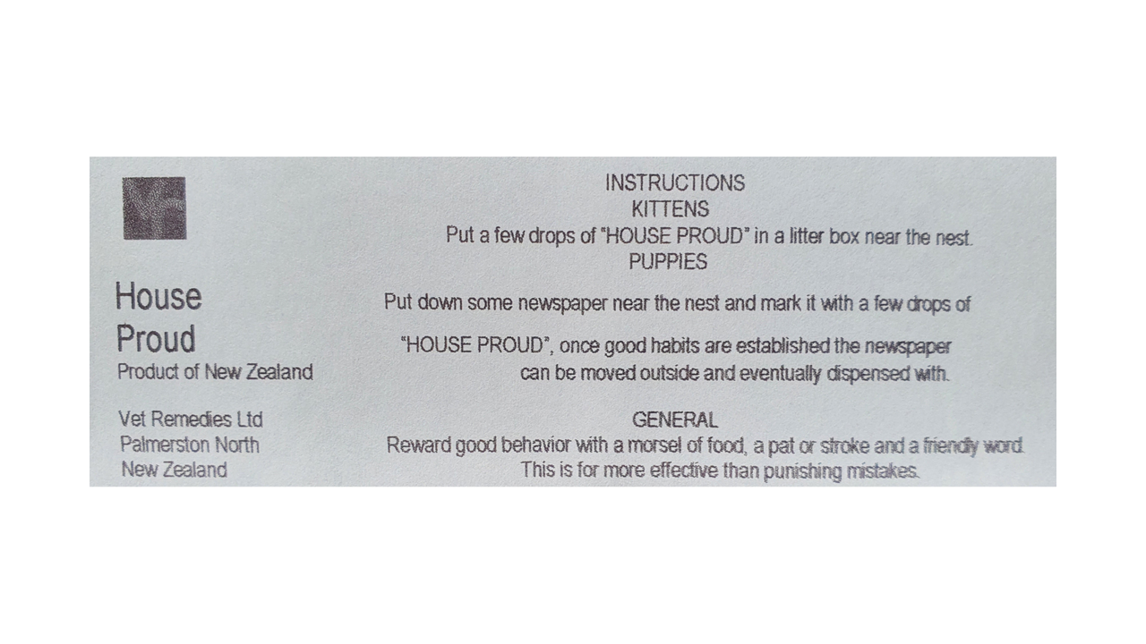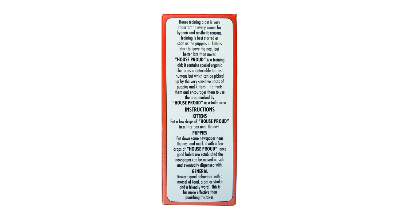 House Proud is a fantastic training aid for your puppy or kitten. It contains special organic compounds that are undetectable to most humans, but can be picked up by the very sensitive noses of puppies and kittens. It works as an attractant, encouraging them to use the area marked with House Proud as a toileting area.
