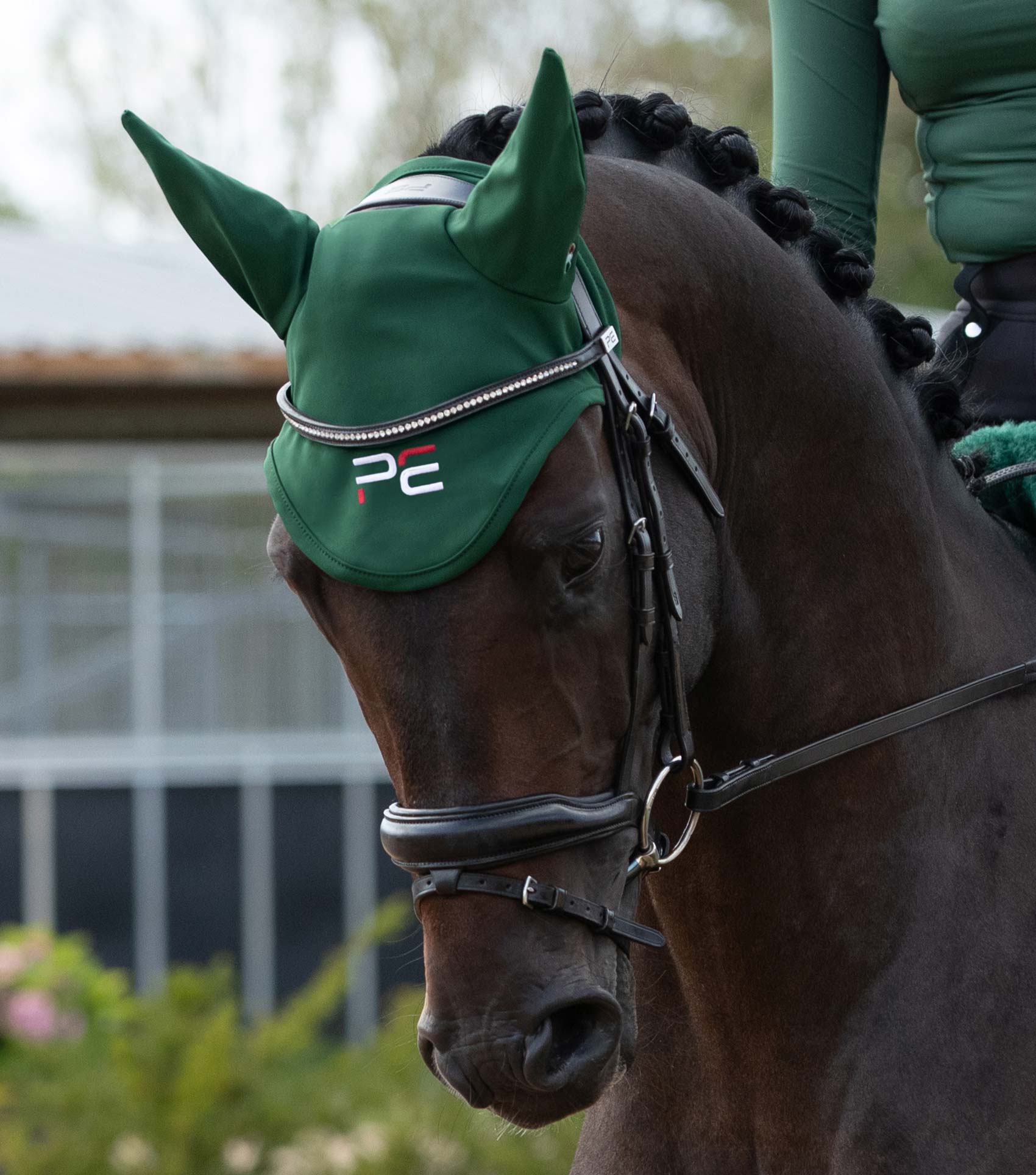 The Atlas fly veil has been designed to protect your horse from insects and reduce noise, increasing focus and concentration. Elegant and functional, this luxury fly veil comes with the PE logo embroidered on the front, as well as the signature 'PE' circles printed on the side of the ears.