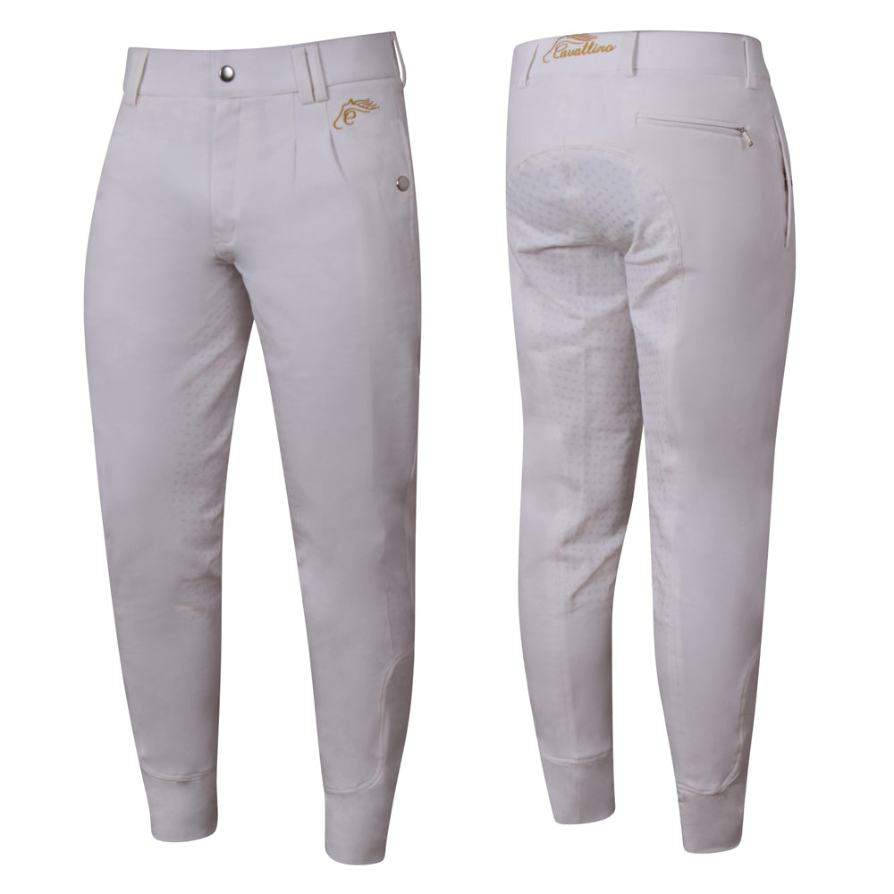 Men’s breeches have full silicon grip seat, pleated front, two domed closure side pockets and Lycra socks.