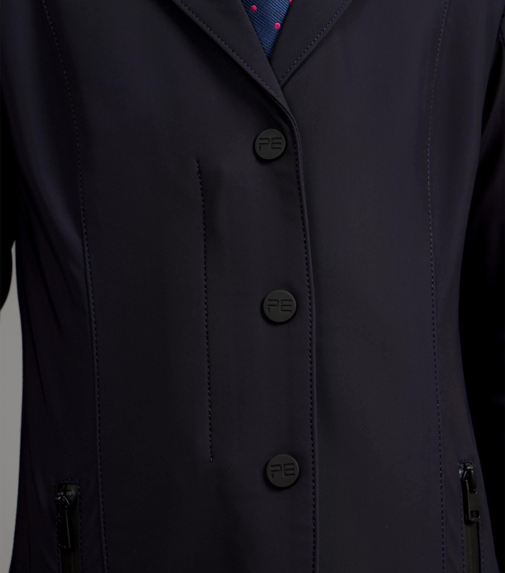 Classically cut, this competition jacket is formed to provide a flattering silhouette, with meticulously placed style lines. A traditional notched lapel collar sits at the top of a YKK zip, concealed by a clean press stud closure. Two pockets offer a place for storing your valuables, with added security provided by the zip closures of a matte finish. The subtle matte styling continues across the finer details of this jacket, including the branded press stud closures and PE branding at the periphery of the cuff. Our signature chrome PE badge is situated on the rider’s left arm, presenting continuity with our existing collection. An embossed PE form is elegantly rested on the rider’s right arm, boasting the quality and functionality of this luxury performance jacket.