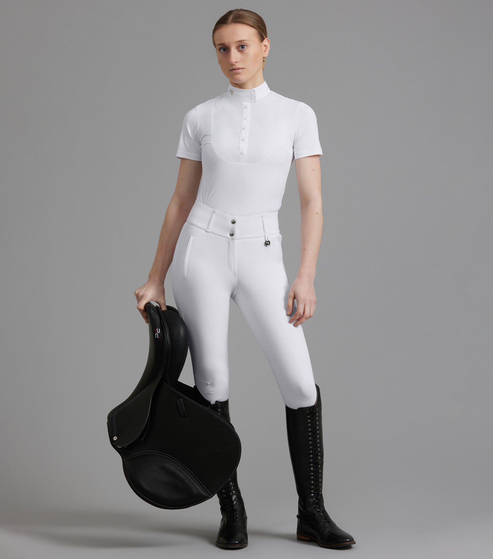 The Famosa Ladies Short Sleeve Competition Shirt from the Black Label collection is a stunning white equestrian shirt that exudes elegance and sophistication. The pristine white colour adds a timeless and classic appeal, making it a versatile and stylish choice for any rider. The purity of the white hue accentuates the exquisite detailing of the shirt, allowing the textured poplin bib to stand out beautifully. Whether worn for intense riding sessions or competitions, the white colour of this shirt makes a bold yet understated statement, reflecting the pinnacle of refined aesthetics and elite performance.