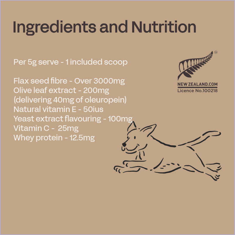 Flax seed fibre, Olive leaf extract, Natural vitamin E, Yeast extract flavoring, Vitamin C, Whey protein