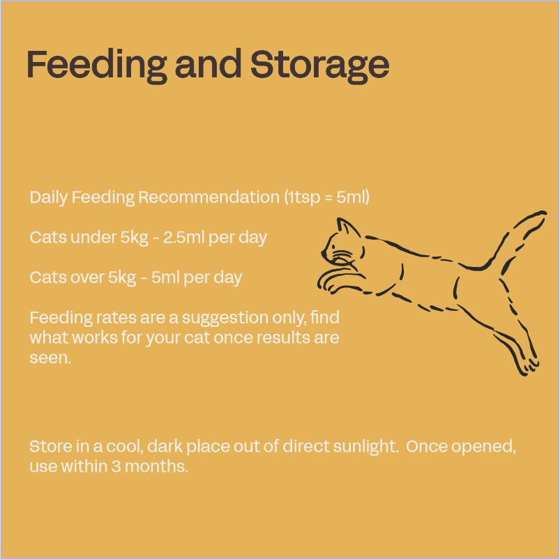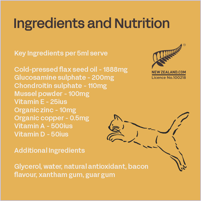 This powerful oil blend contains high levels of Glucosamine & Chondroitin to promote healthy joints, ligaments and connective tissues. Rich in anti-inflammatory Omega 3 from Flax Seed Oil and NZ mussels to put the spring back into your cat’s step and let them live life to the full. Delicious bacon flavour so they'll lick up every last drop.