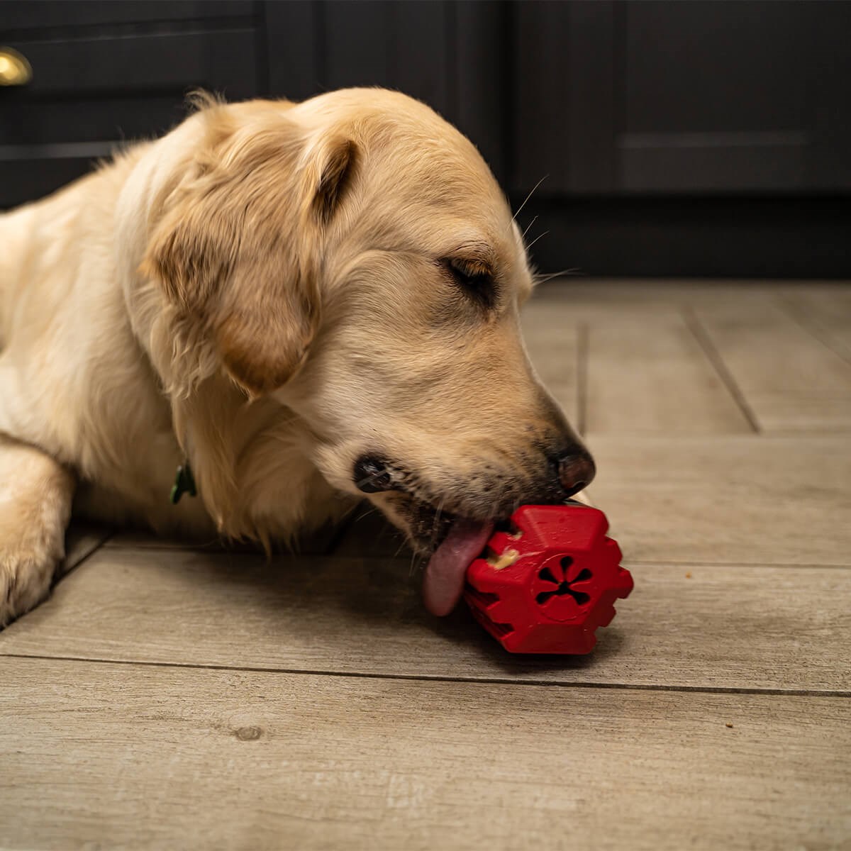 The ultimate fun fetch toy! Brightly coloured and easy to spot, this durable toy keeps your dog active by encouraging them to seek out their dinner. Simply smear with tasty food or pop some kibbles in the hole and watch your dog run.