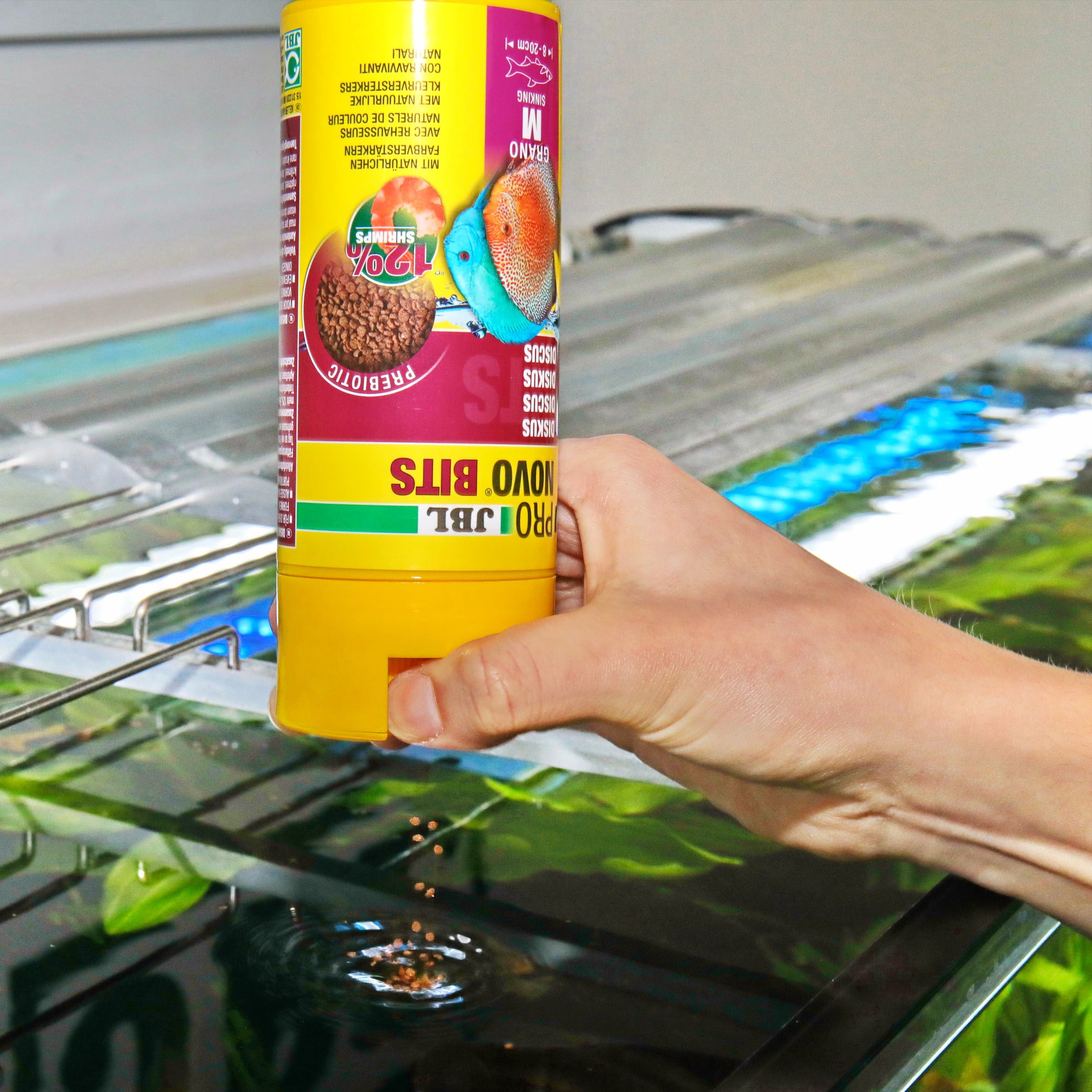 Discus cichlids and some other cichlid species can be very picky about their food. We thought of this when making the JBL PRONOVO BITS and added raw ingredients, such as shrimps, which the fish find irresistible.