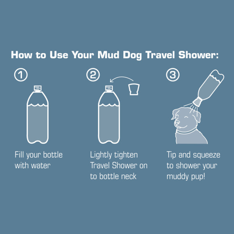 Grab a shower wherever and whenever your dog needs one by turning almost any plastic bottle into a handy shower with the Mud Dog Travel shower. Simply screw the Travel Shower on and voila-it's like that romp in the mud never happened.