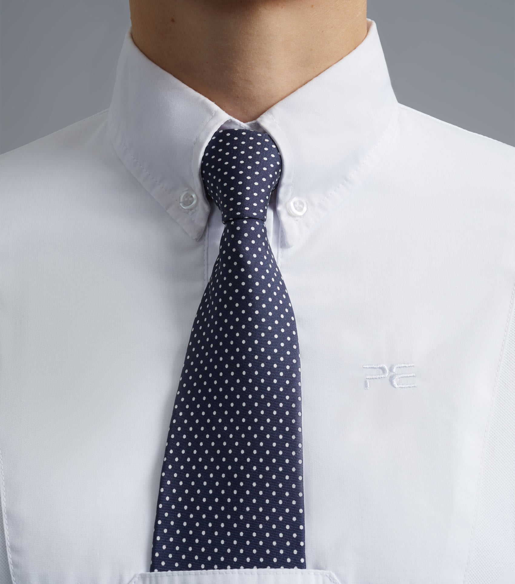 Designed to be worn with a tie and featuring a tie tuck to hold the tie perfectly in place. Holding buttons on the collar corners create a traditional equestrian look, perfect for showing and other riding activities.