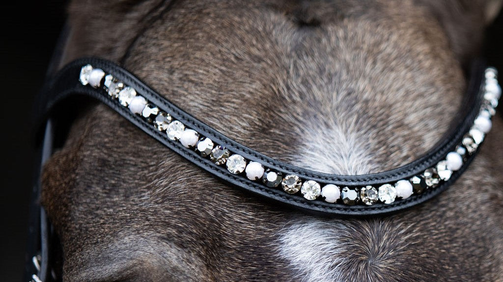 This stunning browband has been handcrafted, with the Austrian stellux elements and pearls placed within a premium quality black leather band.