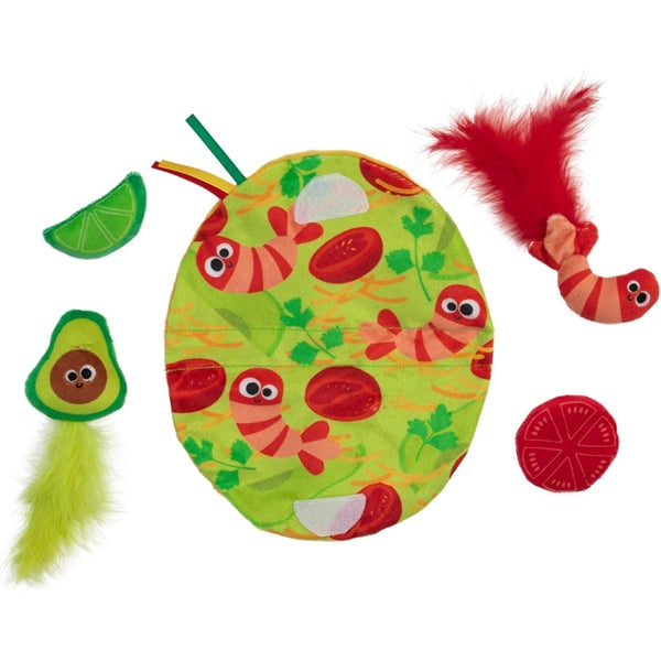 Get ready for a taco-tastic adventure with your feline friend! The Mad Cat Shrimp Taco Stuffer Play Mat is a 5-in-1 interactive toy that will keep your cat entertained for hours. This adorable plush taco play mat features four cuddly taco stuffer toys - a sassy shrimp, a cute avocado, a zesty lime wedge, and a juicy tomato slice - all filled with irresistible catnip and potent silvervine. Hide the toys inside the taco shell for a fun game of hide-and-seek or open it up for a spacious play mat. The crinkly texture and playful design will captivate your cat's attention, while the natural feathers in the toys ignite their hunting instincts. Watch as your cat pounces, bats, and chases their way to endless fun! Our Silvernip® blend ensures that even the pickiest cats will be captivated by this exciting play mat.
