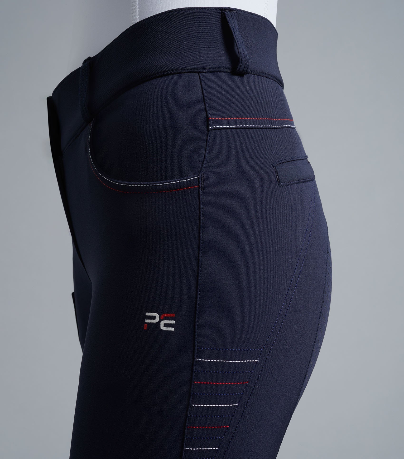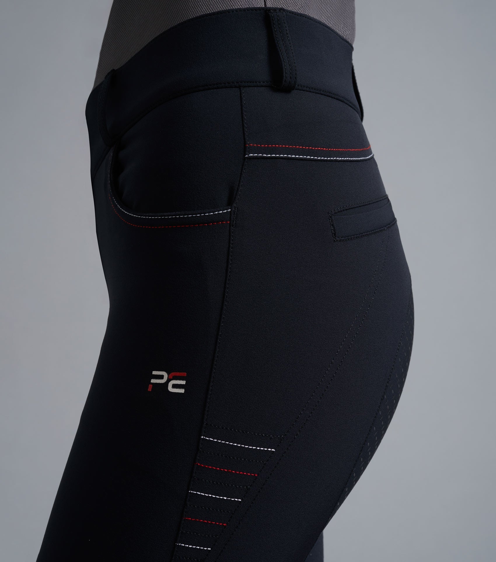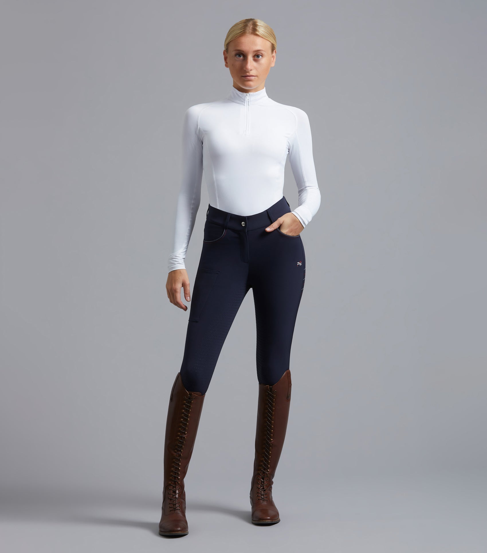 The Moneta features a full gel seat of silicone for added stability when in the saddle, with stretch-knit sock bottoms that improve fit beneath riding boots. These riding breeches are ideal for a range of disciplines. The two front jean-style pockets secure personal belongings alongside a phone pocket on the left thigh. These breeches are finished with perforated PE branding for a modern touch.
