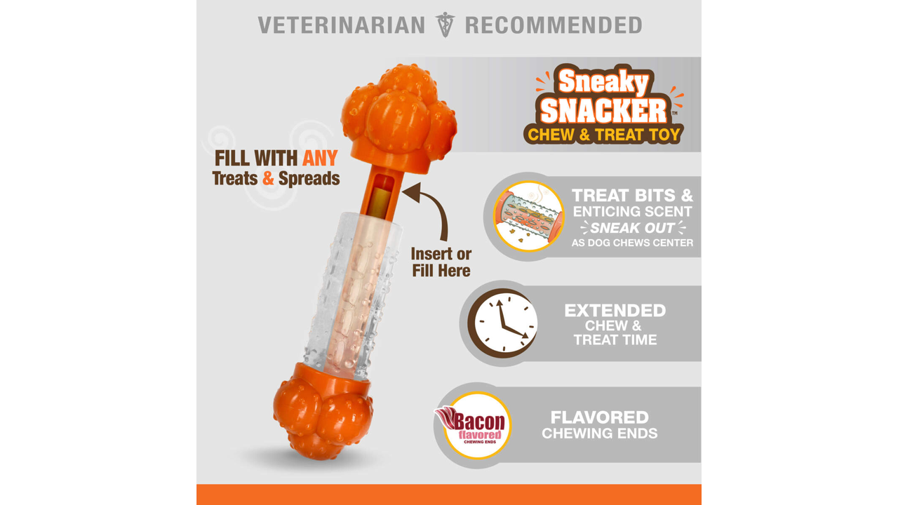 Extend chew time and keep your dog busy longer with the Sneaky Snacker Chew & Treat Toy. This amusing toy opens up so you can insert all sorts of treats or spreads inside. Once it’s securely locked back in place, let the long-lasting chewing challenge begin! Thoughtfully designed with a flexible center and small openings, this dog toy allows your furry friend to smell the deliciousness you place inside. As your dog chews, small bits of the treat slowly release. This interactive dog toy has durable, bacon-flavored chewing ends with an enticing nubby texture that helps clean teeth as dogs chew. Treat your furry friend to this delicious and captivating activity!