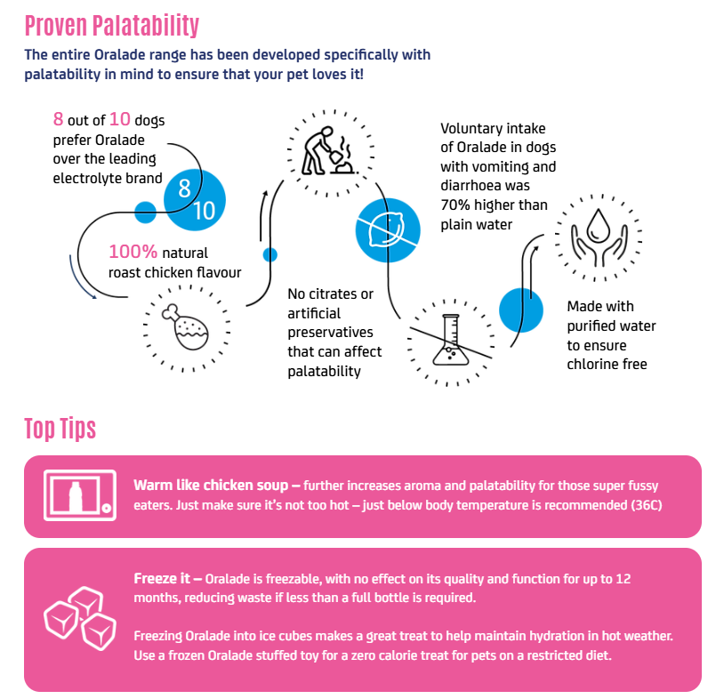 Oralade® RF+ is fast-acting isotonic formula featuring 100% natural chicken flavour – because taste really matters for our pets!