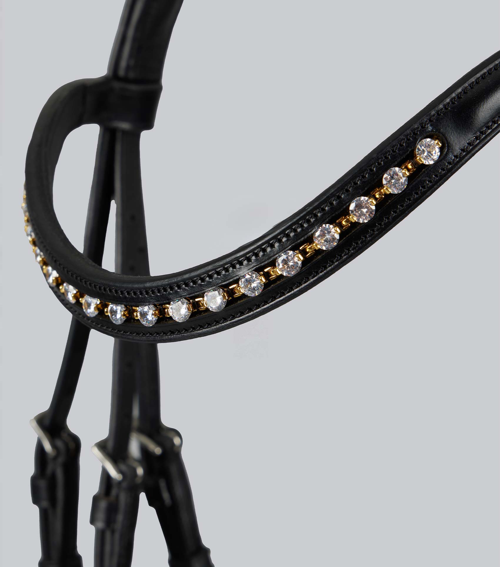 The bridle is further enhanced by its exquisite diamanté browband, adding a touch of glamour and sophistication to the overall design. The shimmering diamanté detailing not only catches the eye but also adds a luxurious touch to the bridle. The browband’s elegant appearance complements the high-quality leather and thoughtful design of the bridle, making it a standout choice for all equestrians.