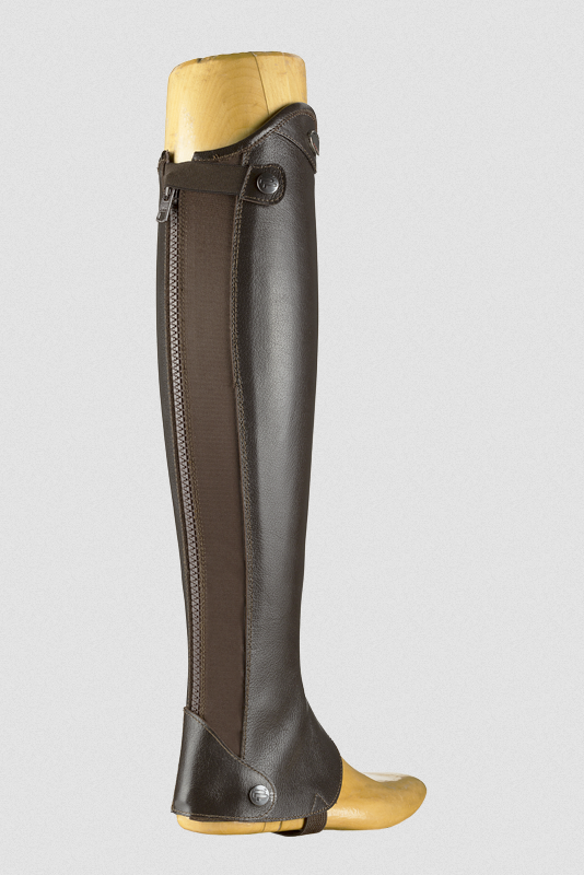 The ELASTIC mini chaps are a technologically superior product, handcrafted from full-grain calfskin or buffalo leather. The rear elastic band ensures flexibility and maximum adhesion to the leg, all condensed into a clean and elegant design. The reinforced zippers, the unlined leg and the leather zipper protections complete this elegant Italian craft product.