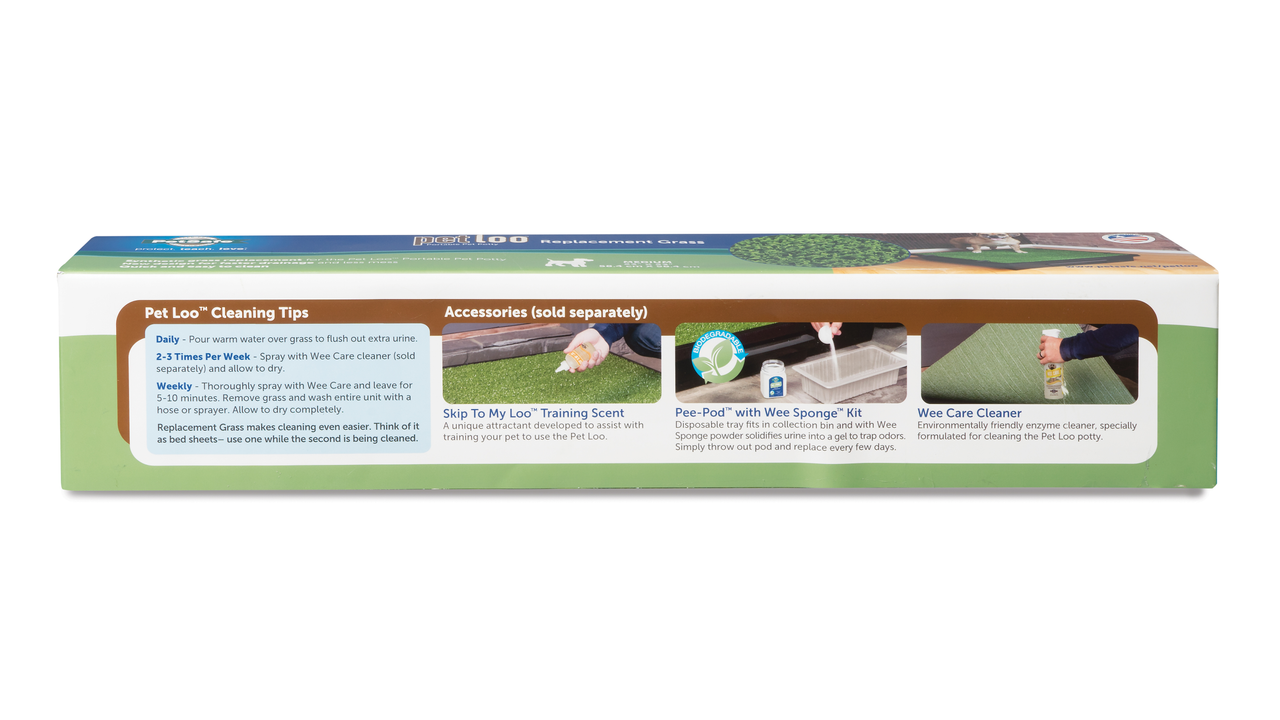 The PetSafe® Pet Loo Replacement Grass is specifically designed to work with the Pet Loo® Pet Toilet. The grass mat allows liquid to drain easily, offering less mess and easier clean-up. Make clean-up even simpler by having extra turf on hand for your pet to use while the other is being cleaned. Trust PetSafe® to help keep your pet healthy, safe and happy.