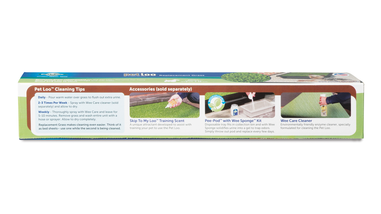 The PetSafe® Pet Loo Replacement Grass is specifically designed to work with the Pet Loo® Pet Toilet. The grass mat allows liquid to drain easily, offering less mess and easier clean-up. Make clean-up even simpler by having extra turf on hand for your pet to use while the other is being cleaned. Trust PetSafe® to help keep your pet healthy, safe and happy.