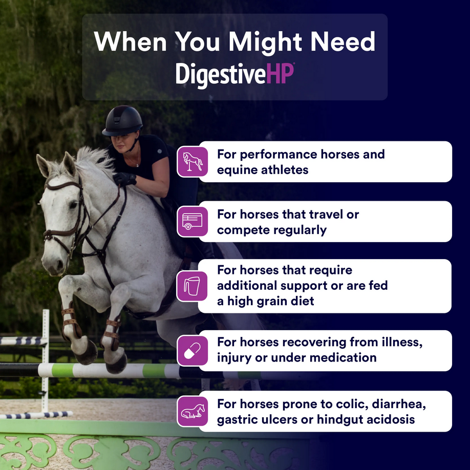 DigestiveHP is built for horses under intense stress, in high work, competition or recovering from digestive challenges.