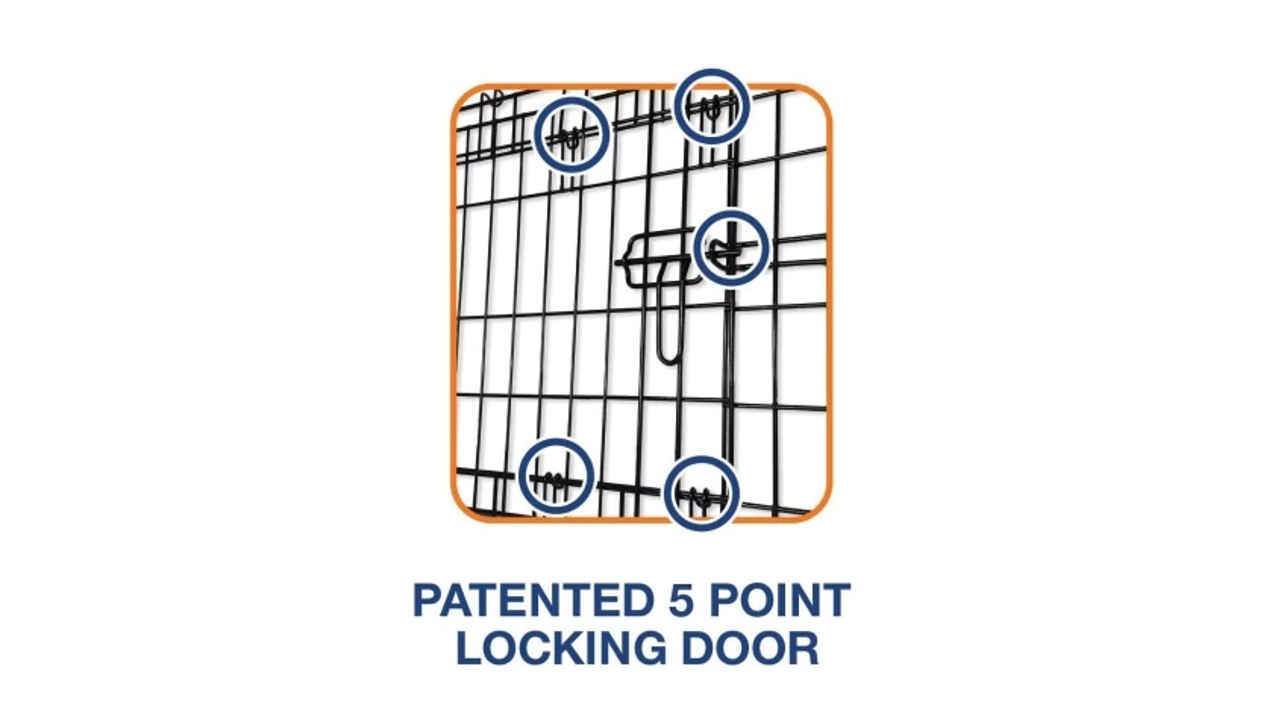 Designed with a pet's safety in mind, the ProValu 2 Door Wire Crate features a patented 5-Point Locking System that eliminates any gaps in the top, sides, and middle of the door increasing the strength and safety of the door system.