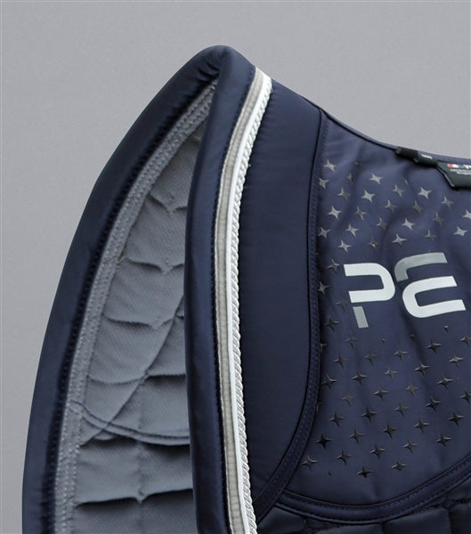 The lower section of the pad is constructed in an elegantly refined cushioned quilting. Lined on the underside with a highly absorbent fabric featuring anti-static & anti-bacterial finishes. This advanced lining helps keep your horse comfortable, wicking moisture away from their skin during exercise.