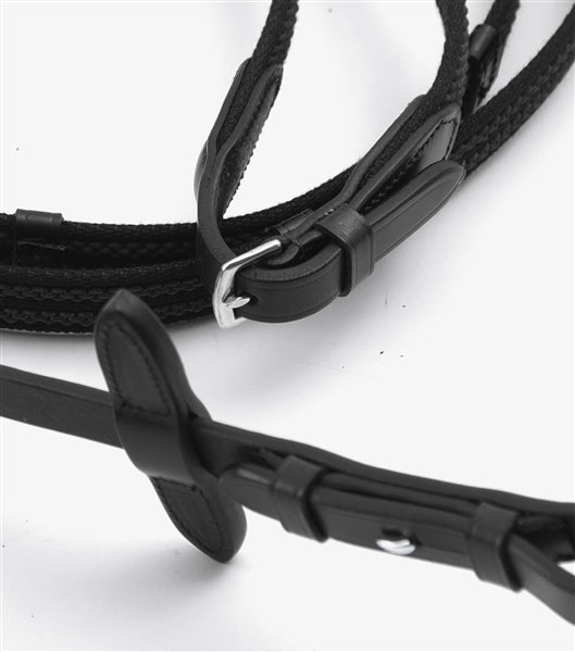 Finished with leather martingale stoppers and stainless steel billet fastenings, these reins are ideal for those who need a strong grip without compromising on flexibility. The perfect choice for many equestrian disciplines.