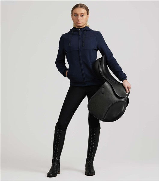 Its minimalist full-zip design, combined with a lightweight yet warm structure, makes this sweatshirt perfect for transitioning between seasons. It offers a sophisticated, relaxed fit with understated branding that appeals to both equestrian sport and leisure. Enhance your wardrobe with this luxurious French Navy sweatshirt, a wardrobe essential that harmoniously combines fashion and functionality.