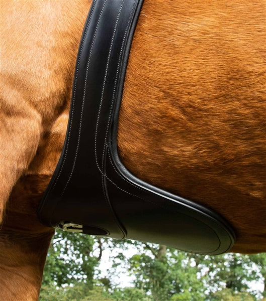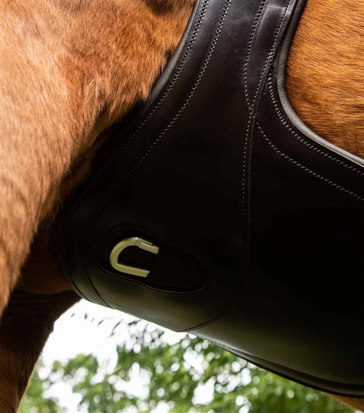 Anatomical shaping provides more room behind the horse’s front legs, decreasing restriction with the potential of increasing performance. Smooth leather panel work combined with high quality stitch lines provide a sleek, professional aesthetic. One central clip ring and two side D-Rings have been added for the attachment of martingales, breastplates and/or training aids. Finished with premium quality stainless steel buckles, this jumping girth is ideal for use on sensitive horses in everyday work or at competitions