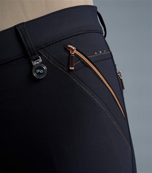 Tailored to provide a flattering, figure-hugging fit whilst allowing superb freedom of movement in and out of the saddle. The Milliania Riding Breeches display rose gold metallic zips, paired with delicate crystal detailing adding a subtle sparkle. Designed with functionality in mind, these breeches offer two front zipped pockets as well as two rear pockets to store personal belongings.