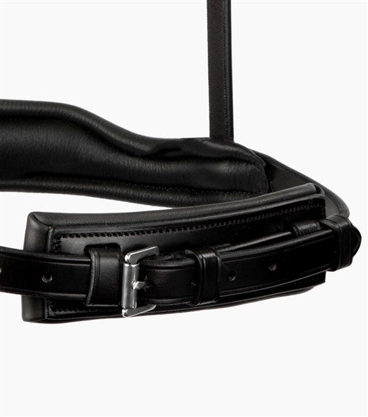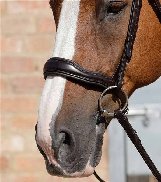 Our unique anatomically shaped snaffle noseband dips down at the sides to avoid contact with the horse's cheekbones, alleviating pressure and potentially heightening performance. Premium quality stainless steel fastenings and elegant stitching completes an overall stunning look.