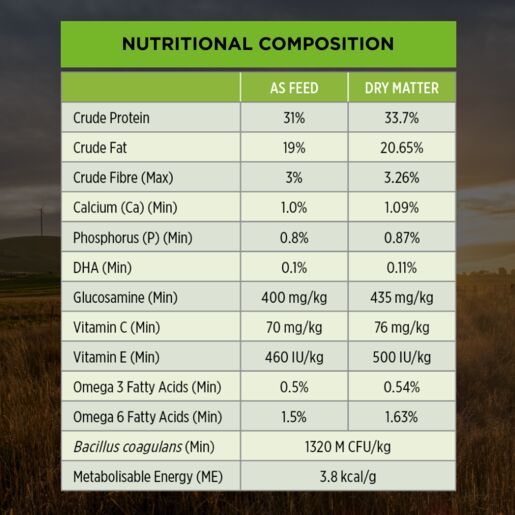 Chicken meal and chicken (37%); brewers rice; whole grain wheat; oats; animal fat; wheat gluten; animal digest; barley; beet pulp; minerals, vitamins, amino acids (including calcium, phosphorous, sodium, chloride, potassium, magnesium, zinc, iron, manganese, copper, selenium, iodine, aluminosilicate, vitamin A, B vitamins, vitamin C, vitamin D, vitamin E, choline, folic acid); fish meal and fish oil (source of DHA); colostrum (0.1%) and natural antioxidants, dried Bacillus coagulans fermentation product