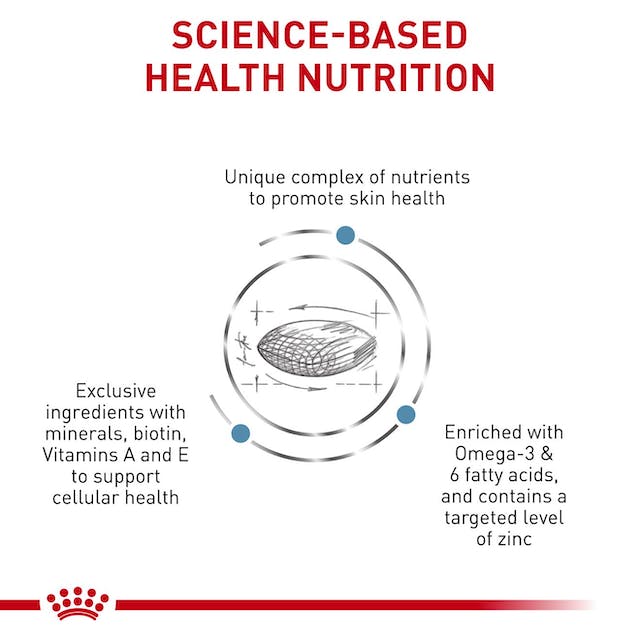 ROYAL CANIN® SKINTOPIC SMALL DOG is a complete diet for adult small breed dogs ≤10kg. The diet is formulated with a unique DERMAUXILIUM™ complex of active compounds (including EPA/DHA and linoleic acid), clinically proven to help support optimal skin quality and coat health in dogs with atopic dermatitis (skin lesions and inflammation of the ear canal) and hair loss. Skintopic Small Dog is specifically tailored to the digestive, dental and urinary needs of small dogs, and is suitable for their small jaws.