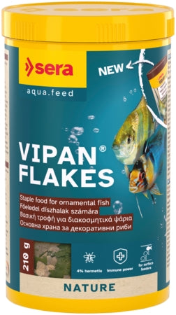 Vipan Flakes is the staple food consisting of floating flakes without dyes and preservatives for all ornamental fish eating at the water surface.