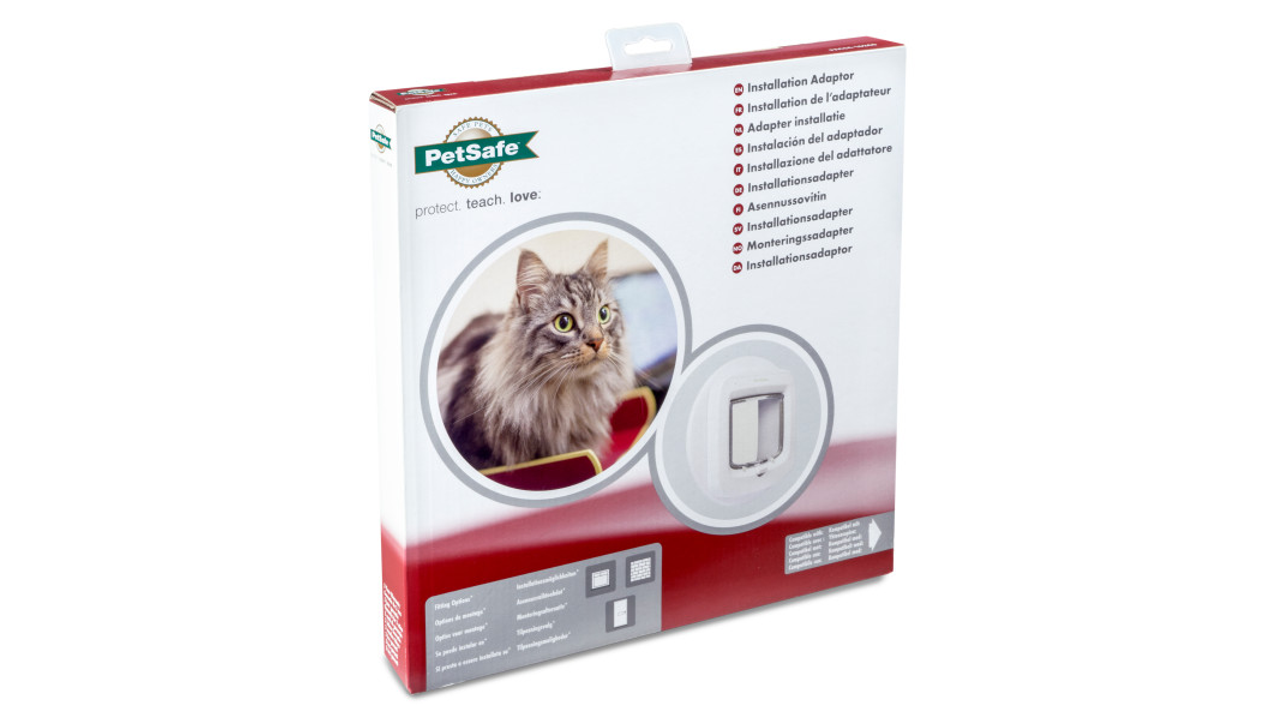The PetSafe® Microchip Cat Door Installation Adaptor allows for installation into metal or glass doors, windows or walls. The adaptor improves the performance of the microchip reader when installing the PetSafe® Microchip Cat Door into metal doors and supplies additional support for window and glass installations. Your pet deserves the best. Trust PetSafe® to help keep your pet healthy, safe and happy.