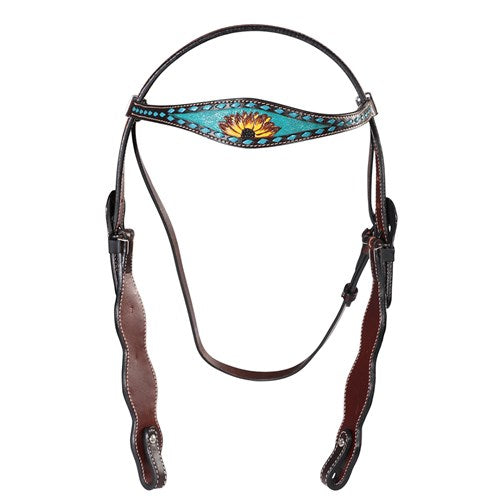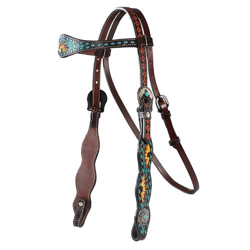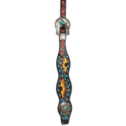 For sunflower lovers and Western style enthusiasts, the Fort Worth Vaquera Headstall is a vibrant, eye-catching addition to any tack room. Featuring a hand painted sunflower design, turquoise buckstitch accents, and German silver buckles, it combines artistry with functionality. As part of the unique Vaquera set, this headstall brings personality and flair to everyday rides or special events.