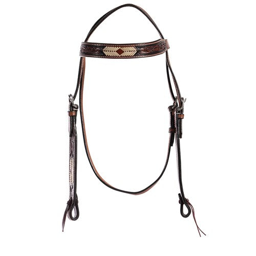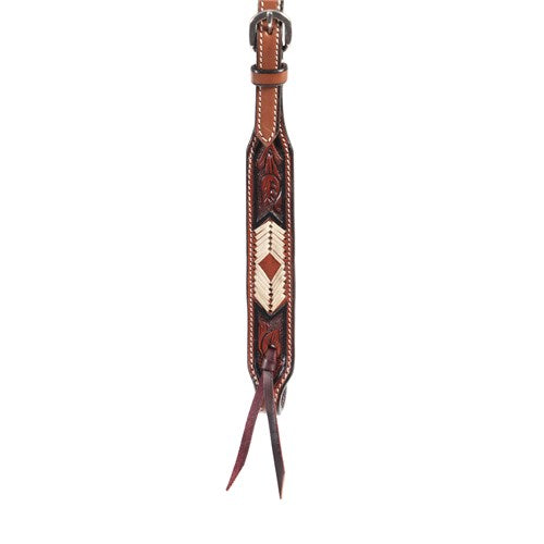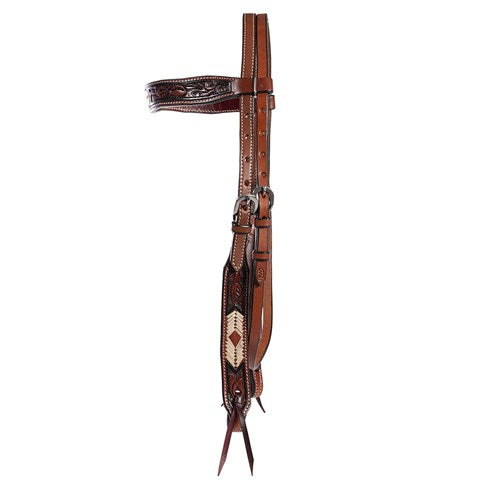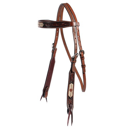 This striking headstall features an arrow pattern on hand-tooled leather browband and cheek pieces.