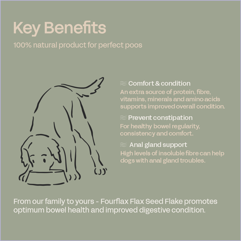 Packed full of insoluble fibre, Fourflax Flax Seed Flake can help dogs with anal gland troubles and can prevent constipation. The ideal supplement for bowel regularity, consistency and comfort for you pooch! An extra source of protein, fibre, vitamins, minerals and amino acids supports improved overall condition.