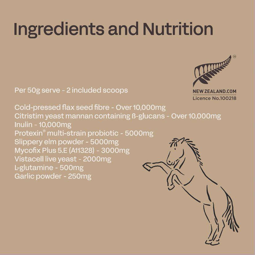 Flax seed fibre, Citristim yeast mannan containing beta-glucans, inulin, Protexin multi-strain probiotic, slippery elm powder, Mycofix Plus 5.E (A11328), Vistacell live yeast, L-glutamine, garlic flavour.