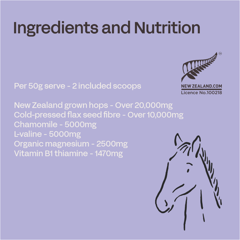New Zealand grown hops, flax seed fibre, chamomile, L-valine, organic magnesium, vitamin B1 thiamine.