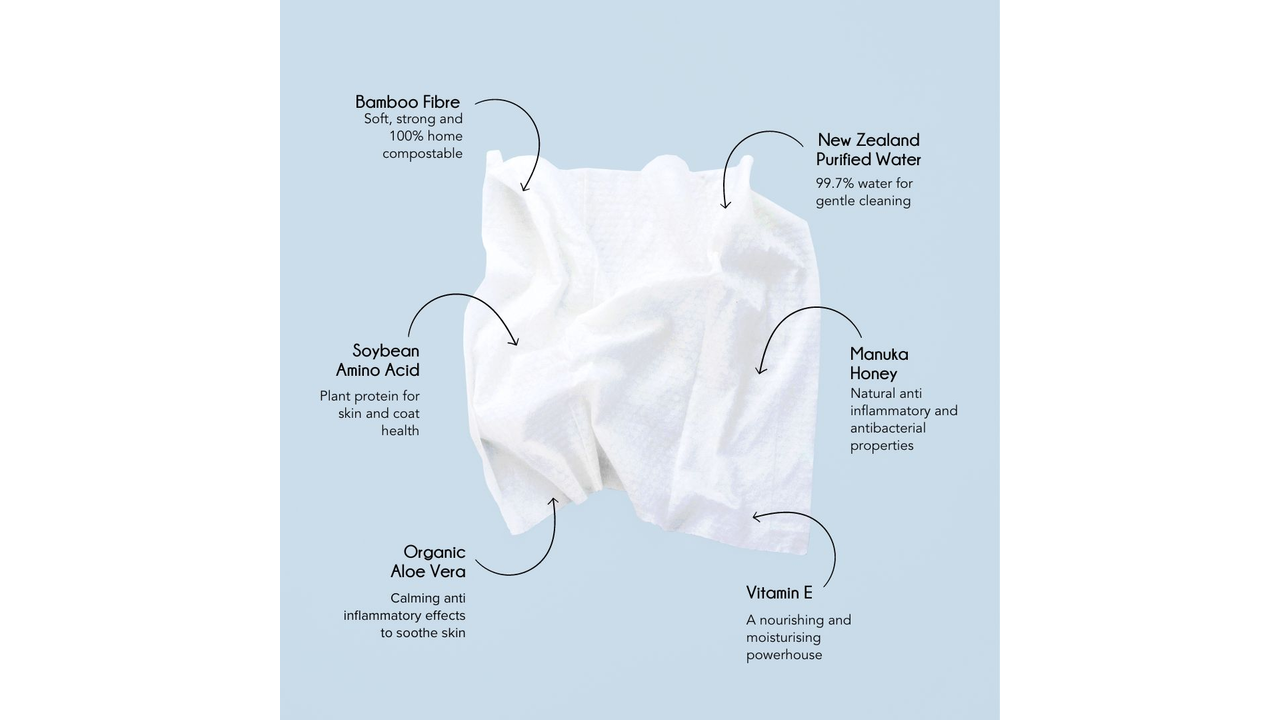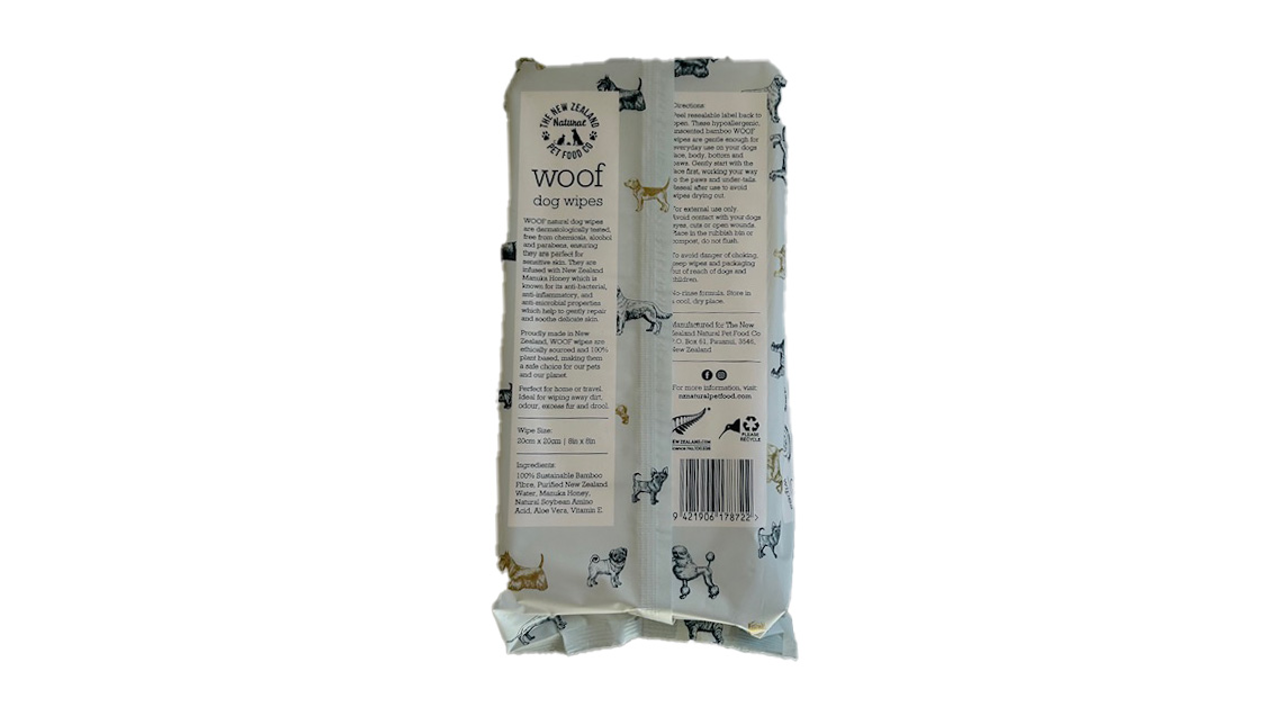 WOOF natural dog wipes are dermatologically tested, free from chemicals, alcohol and parabens, ensuring they are perfecy for sensitive skin. They are infused with New Zealand Manuka Honey which is known for its anti-bacterial, anti-inflammatory, and anti-microbial properties which help to gently repair and soothe delicate skin.