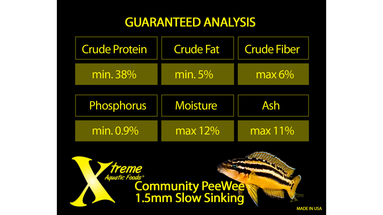 Xtreme has the perfect slow-sinking pellets for all small to medium-sized tropical and community fish. Community PeeWee 1.5mm Slow-Sinking Pellets combine the excellent protein ingredients of cold-water krill, shrimp meal, squid meal and green peas with USA Non-GMO Farm-grown spirulina, vitamins, carbs, attractants and trace elements. This is a fully balanced diet, with no added hormones or cheap low-grade fillers.