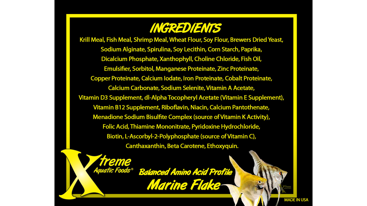 Krill Meal, Fish Meal, Shrimp Meal, Wheat Flour, Soy Flour, Brewers Dried Yeast, Sodium Alginate, Spirulina, Soy Lecithin, Corn Starch, Paprika, Dicalcium Phosphate, Xanthophyll, Choline Chloride, Fish Oil, Emulsifier, Sorbitol, Manganese Proteinate, Zinc Proteinate, Copper Proteinate, Calcium Iodate, Iron Proteinate, Cobalt Proteinate, Calcium Carbonate, Sodium Selenite, Vitamin A Acetate, Vitamin D3 Supplement, dl-Alpha Tocopheryl Acetate (Vitamin E Supplement), Vitamin B12 Supplement, Riboflavin, Niacin, Calcium Pantothenate, Menadione Sodium Bisulfite Complex (source of Vitamin K Activity), Folic Acid, Thiamine Mononitrate, Pyridoxine Hydrochloride, Biotin, L-Ascorbyl-2-Polyphosphate (source of Vitamin C), Canthaxanthin, Beta Carotene, Ethoxyquin.
