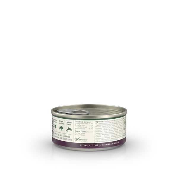 New Zealand Wallaby, Water Sufficient for Processing, Lamb Liver, Lamb Lung, Lamb Green Tripe, Lamb Heart, Lamb Kidney, New Zealand Green Mussels, Lamb Plasma, Dried Yeast, Calcium Carbonate, Salmon Oil, Guar Gum, Agar Agar, Potassium Chloride, Taurine, Choline Chloride, Iron Proteinate, Zinc Glycine Complex, Niacin Supplement, Alpha-Tocopherol Acetate, Sodium Selenite, Manganese Proteinate, Copper Glycine Complex, Thiamine Mononitrate, Calcium Pantothenate, Riboflavin, Pyridoxine Hydrochloride, Vitamin A Acetate, Biotin, Vitamin B12 Supplement, Calcium Iodate, Folic Acid, Cholecalciferol.
