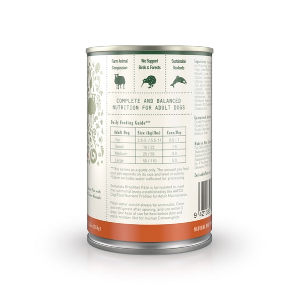 Introducing Zealandia Nutrition to your pet: We recommend that you transition your pet from their old diet to their new diet over a 7 day period, by feeding increasing percentages of Zealandia Pet Nutrition until reaching 100% after 7 days. Toy (2.5/5kg): 1 x 185g can per day. 0.5/1 x 385g can per day. Small (10kg): 2 x 185g can per day 0.5 x 385g cans per day. Medium (25kg): 3 x 385g cans per day. Large (50kg): 5 x 385g cans per day. Recommended feeding guidelines are also included on each can of Zealandia pet food. This information is based on your pet's weight, life-stage and level of exercise.
