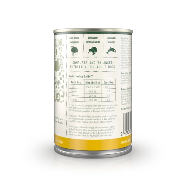 Introducing Zealandia Nutrition to your pet: We recommend that you transition your pet from their old diet to their new diet over a 7 day period, by feeding increasing percentages of Zealandia Pet Nutrition until reaching 100% after 7 days. Toy (2.5/5kg): 1 x 170g can per day. 0.5/1 x 385g can per day. Small (10kg): 2 x 170g can per day 0.5 x 385g cans per day. Medium (25kg): 3 x 385g cans per day. Large (50kg): 5 x 385g cans per day. Recommended feeding guidelines are also included on each can of Zealandia pet food. This information is based on your pet's weight, life-stage and level of exercise.