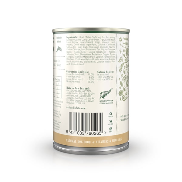 Goat, Water Sufficient for Processing, Lamb Liver, Lamb Lung, Lamb Green Tripe, Lamb Heart, Lamb Kidney, New Zealand Green Mussels, Lamb Plasma, Dried Yeast, Calcium Carbonate, Salmon Oil, Guar Gum, Agar Agar, Potassium Chloride, Taurine, Choline Chloride, Iron Proteinate, Zinc Glycine Complex, Niacin Supplement, Alpha-Tocopherol Acetate, Sodium Selenite, Manganese Proteinate, Copper Glycine Complex, Thiamine Mononitrate, Calcium Pantothenate, Riboflavin, Pyridoxine Hydrochloride, Vitamin A Acetate, Biotin, Vitamin B12 Supplement, Calcium Iodate, Folic Acid, Cholecalciferol.