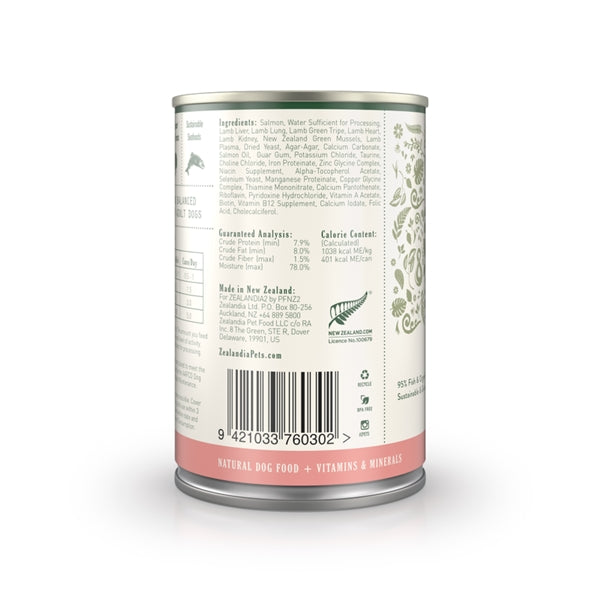 Salmon, Water Sufficient for Processing, Lamb Liver, Lamb Lung, Lamb Green Tripe, Lamb Heart, Lamb Kidney, New Zealand Green Mussels, Lamb Plasma, Dried Yeast, Agar-Agar, Calcium Carbonate, Salmon Oil, Guar Gum, Potassium Chloride, Taurine, Choline Chloride, Iron Proteinate, Zinc Glycine Complex, Niacin Supplement, Alpha-Tocopherol Acetate, Selenium Yeast, Manganese Proteinate, Copper Glycine Complex, Thiamine Mononitrate, Calcium Pantothenate, Riboflavin, Pyridoxine Hydrochloride, Vitamin A Acetate, Biotin, Vitamin B12 Supplement, Calcium Iodate, Folic Acid, Cholecalciferol.