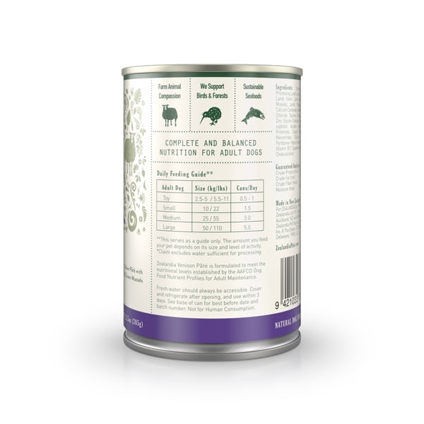 Introducing Zealandia Nutrition to your pet: We recommend that you transition your pet from their old diet to their new diet over a 7 day period, by feeding increasing percentages of Zealandia Pet Nutrition until reaching 100% after 7 days. Toy (2.5/5kg): 1 x 185g can per day. 0.5/1 x 385g can per day. Small (10kg): 2 x 185g can per day 0.5 x 385g cans per day. Medium (25kg): 3 x 385g cans per day. Large (50kg): 5 x 385g cans per day. Recommended feeding guidelines are also included on each can of Zealandia pet food. This information is based on your pet's weight, life-stage and level of exercise.