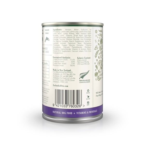 Venison, Water Sufficient for Processing, Lamb Liver, Lamb Lung, Lamb Green Tripe, Lamb Heart, Lamb Kidney, New Zealand Green Mussels, Lamb Plasma, Dried Yeast, Agar-Agar, Calcium Carbonate, Salmon Oil, Guar Gum, Potassium Chloride, Taurine, Choline Chloride, Iron Proteinate, Zinc Glycine Complex, Niacin Supplement, Alpha-Tocopherol Acetate, Selenium Yeast, Manganese Proteinate, Copper Glycine Complex, Thiamine Mononitrate, Calcium Pantothenate, Riboflavin, Pyridoxine Hydrochloride, Vitamin A Acetate, Biotin, Vitamin B12 Supplement, Calcium Iodate, Folic Acid, Cholecalciferol.